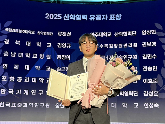 산학협력단(단장 이충일) 류진선 팀장이 10월 29일 대구 EXCO에서 열린 ‘2025년 산학연협력 EXPO’에서 산학협력 활성화에 기여한 공로로 ’2025년 산학협력 유공자 표창(기술이전 및 공동연구 분야)‘을 수상했다.