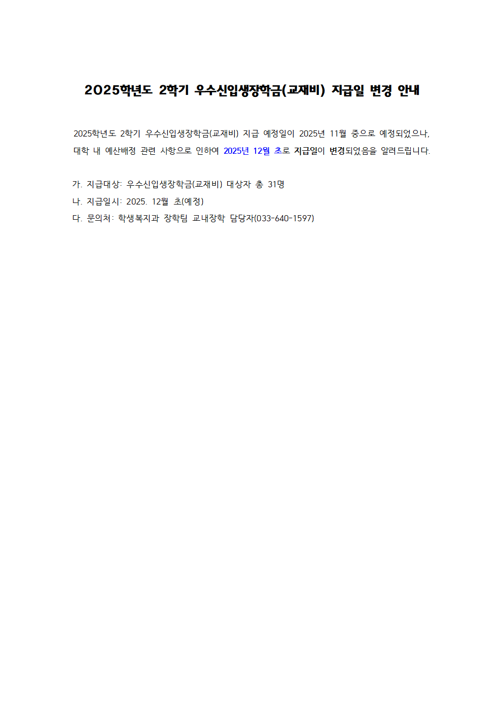 2025학년도 2학기 우수신입생장학금(교재비) 지급일 변경 안내